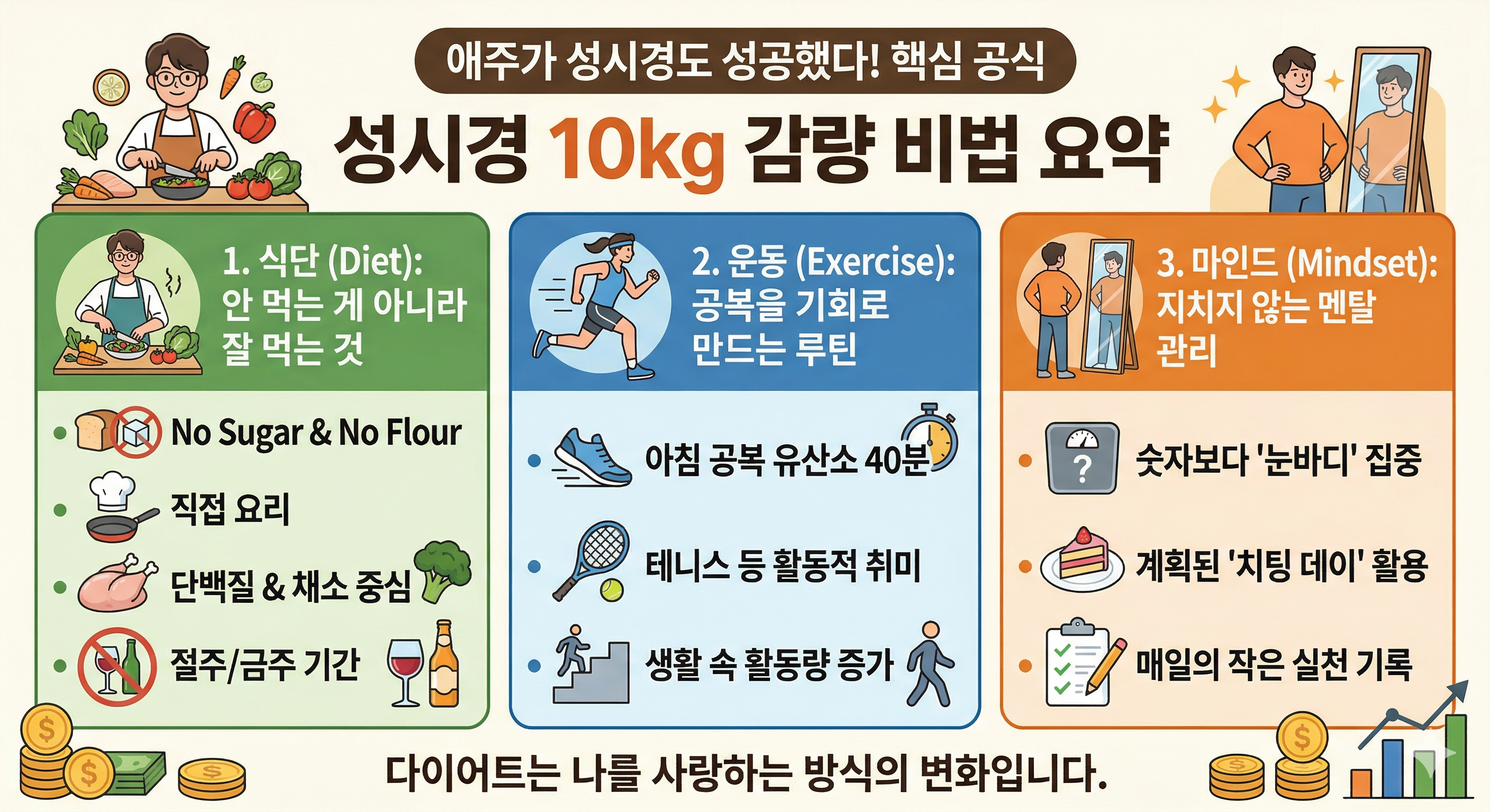 성시경 씨의 10kg 감량이 우리에게 주는 메시지는 명확합니다. 다이어트는 단순히 살을 빼는 행위가 아니라, 나의 나쁜 습관을 버리고 몸을 건강하게 돌보는 '자기 사랑'의 과정이라는 점입니다.