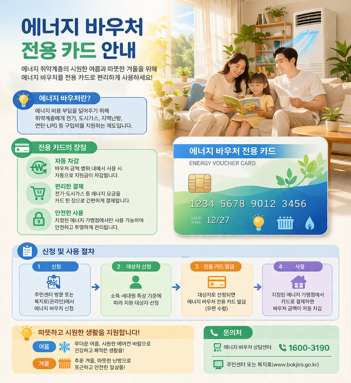 여름철 기록적인 폭염과 겨울철 매서운 한파는 이제 우리 일상의 상수(常數)가 되었습니다. 특히 냉난방비 에너지 가격의 변동폭이 커지면서 고정 지출에 대한 부담은 더욱 가중되고 있습니다. 정부는 이러한 에너지 취약계층의 부담을 덜어주고, 국민 모두가 최소한의 에너지 기본권을 누릴 수 있도록 '에너지 바우처(Energy Voucher)' 제도를 운영하고 있습니다.