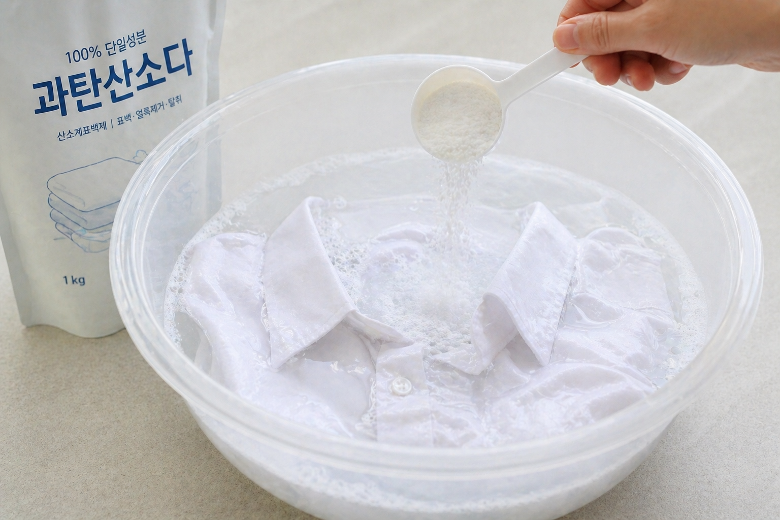 - 온도 설정: 과탄산소다는 찬물에 잘 녹지 않습니다. 40~50도 정도의 따뜻한 물을 준비하십시오. (리넨이나 실크 등 열에 약한 소재는 주의가 필요합니다.)